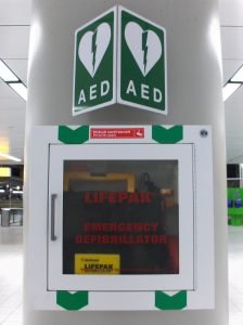 When visiting places like these, it’s a good idea to take note of the AED’s location when you pass through. While they are marked with specific signs, like the symbol here to the left, they can be difficult to track down in the panic of an emergency. Imagine being told be a stranger to quickly go retrieve the AED. You want to help, so you rush into action, but then realize you don’t know where you’re going. These high stress situations can cause unnecessary delays, and it’s in these moments when seconds can mean life or death.